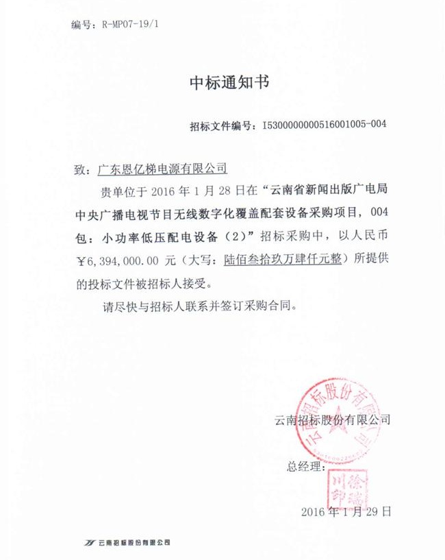 恩億梯電源中標(biāo)云南廣電局中央廣播電視配套設(shè)備采購(gòu)項(xiàng)目