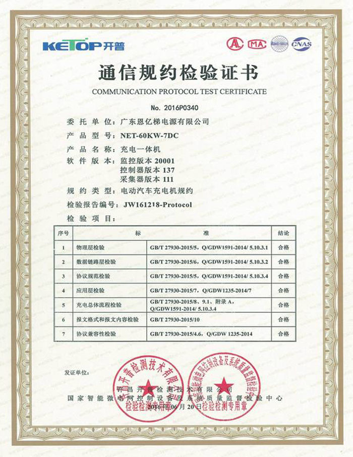 通信規(guī)約檢驗證書(充電一體機(jī))